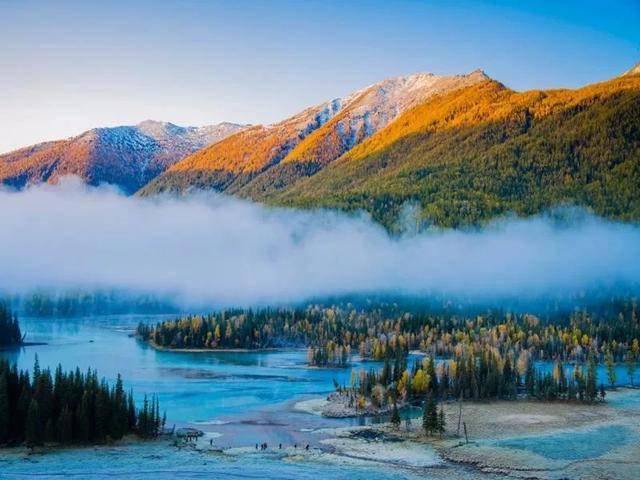 2、喀纳斯湖:被誉为“东方瑞士”,湖水清澈,四周群山环抱,景色如画。